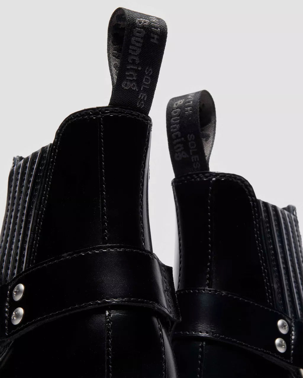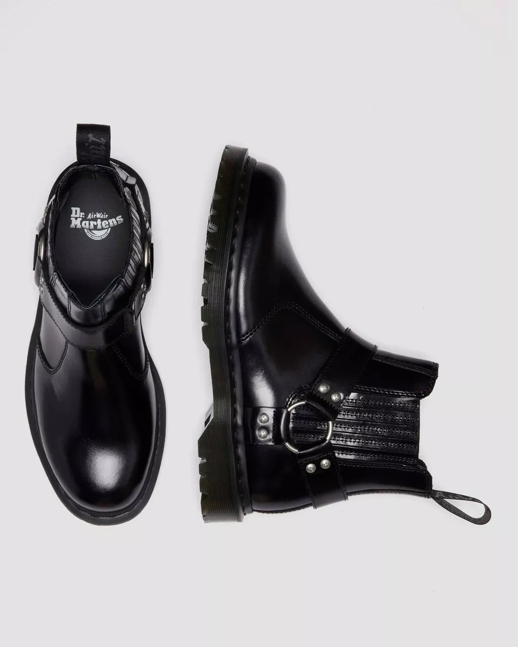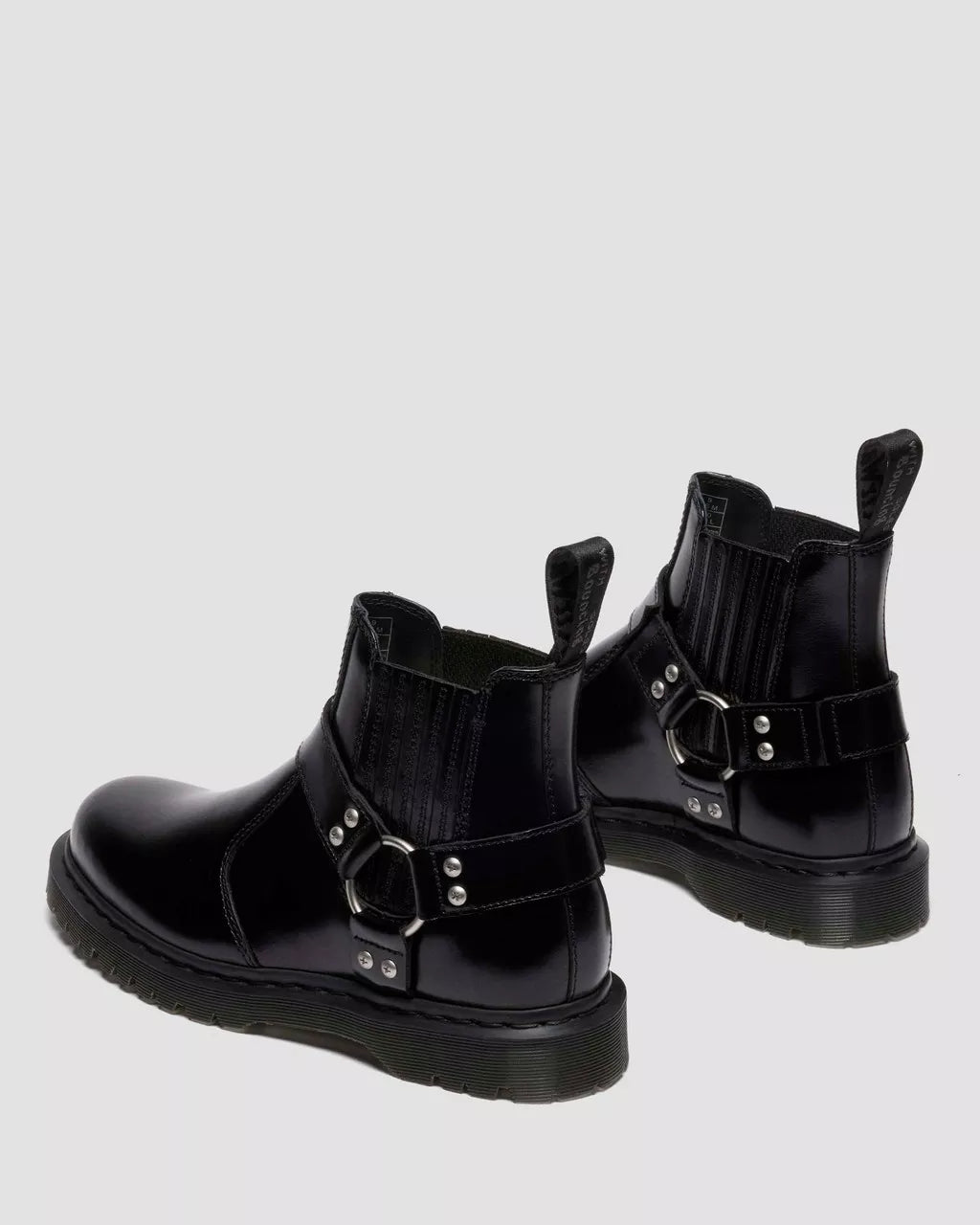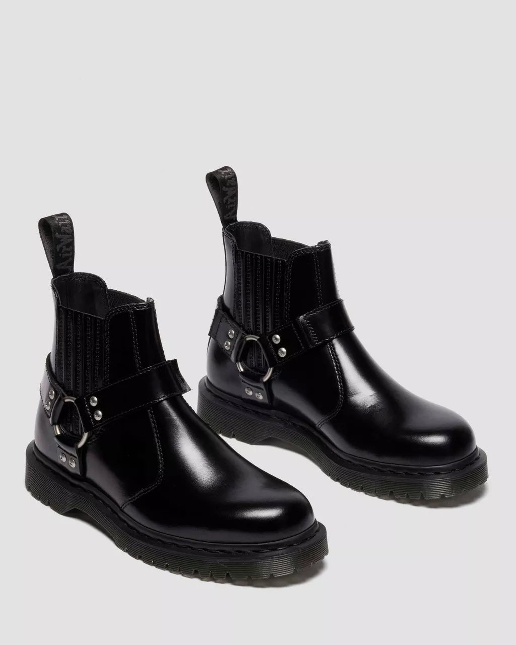 Harness your edge. The 2976 Harness Chelsea boot is intentionally crafted for impact. An alternative take on one of our most classic silhouettes, we remixed it with black Analine leather, and accessorized with screw studs and an oversized ring. With an inner zip for easy pulling on and taking off, monochrome detailing is worked across the boot: a black and gunmetal heel loop, black welt stitching and a smoke BEN outsole with classic grooving.