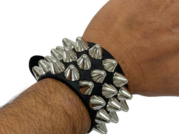 Three row black leather, Tall British 77 Cone studded wristband with Buckle Closure.