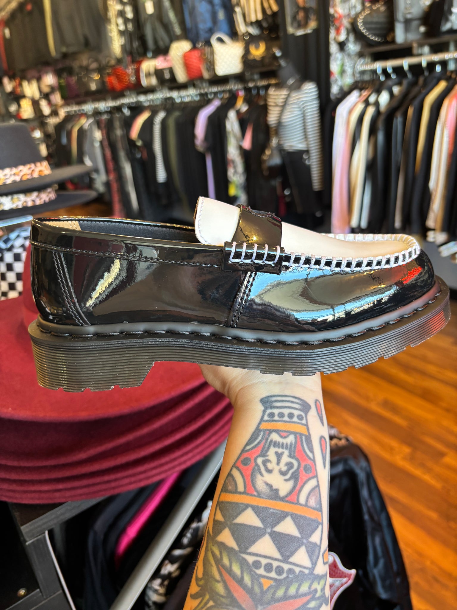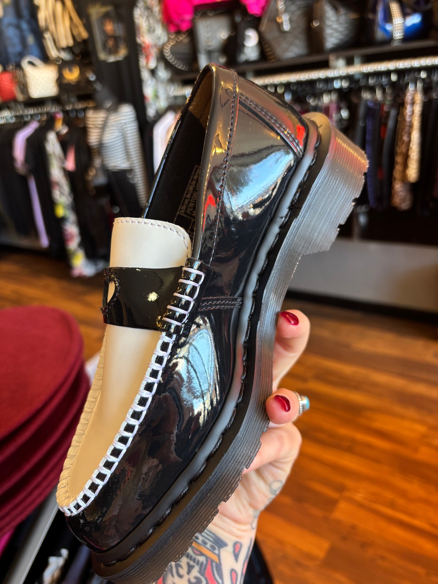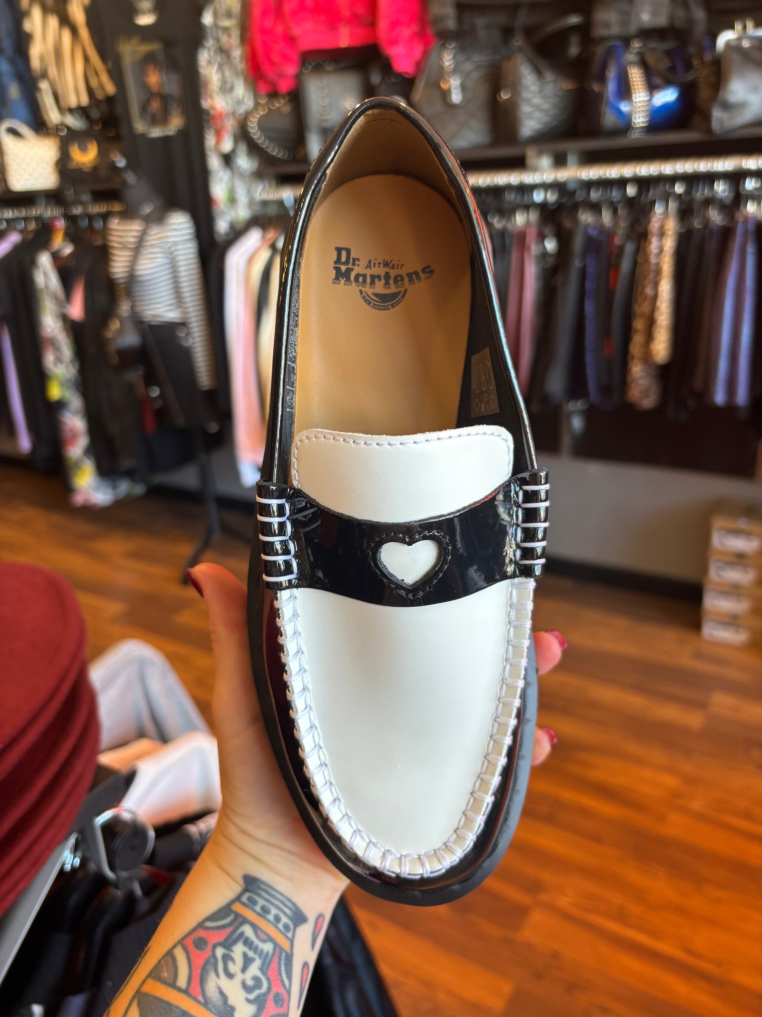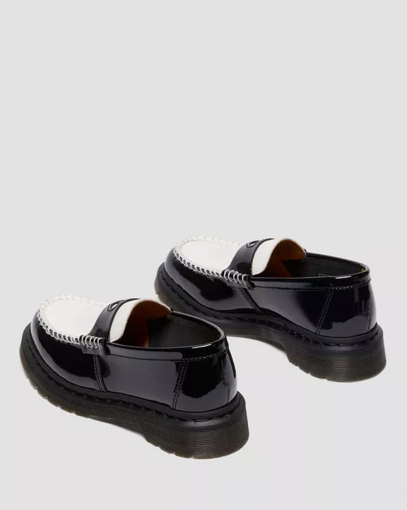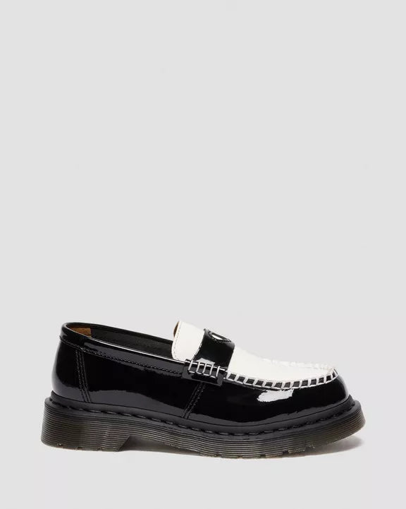 Wear your heart on your shoe. The Penton Heart loafer adds a playful cut-out to a DM’s classic. Wrapped in Patent Lamper leather for a high-shine finish. And Smooth leather across the apron with a cut-out heart on the contrasting saddle. We bordered the apron with standout stitching, while adding subtle black stitching around the welt. The loafer sits on a smoke DMS sole with classic grooving.