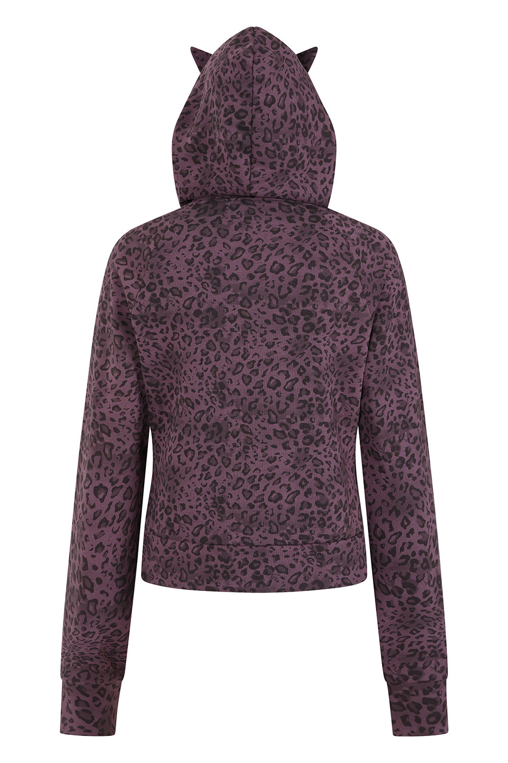 This cropped hoodie combines playful charm with a dark twist. Made from soft fabric in a bold leopard print, it features a fitted silhouette with long sleeves and thumbhole cuffs for extra comfort and edge. The hood is finished with pointed cat ears, adding a fun, kawaii-inspired touch. The full-length front zip is adorned with skull-shaped zip pullers