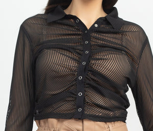A little bit goth, a little bit glam- It’s got long sleeves, a sleek collar, and a stylish shirred-front design. Button-down snap style closure makes it versatile enough for an office or a club.