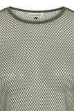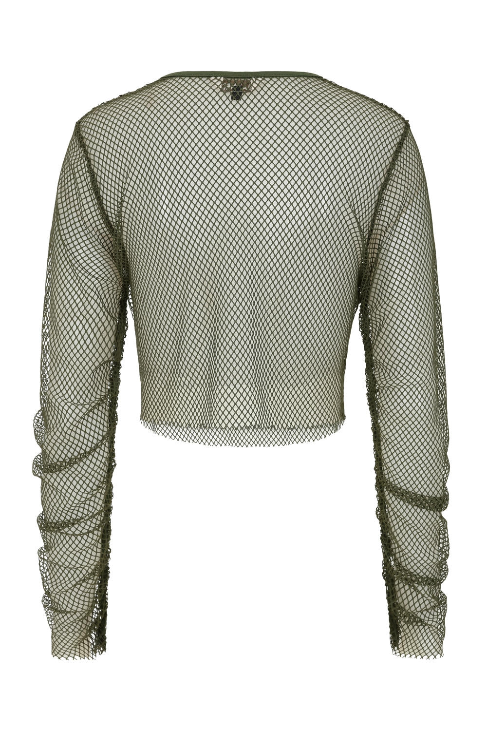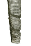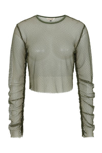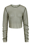 Classic mesh fishnet top with a round neckline. The material features a small, diamond-shaped fishnet pattern that is consistent throughout the piece. The long sleeves are ruched, adding texture and dimension to the overall look. The top is fitted and designed to be layered over or under other clothing, making it a versatile piece.