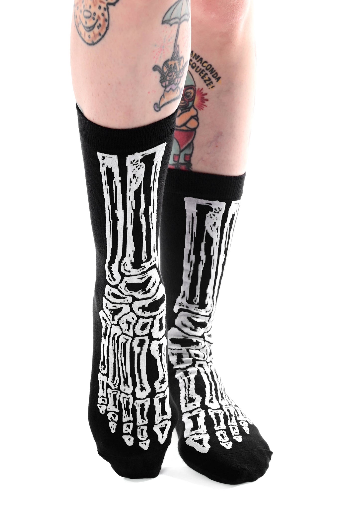 Black socks with comfort toe and white skeleton feet (drawn by us - No Ai art around here ever!) Jacquard cotton with elastic. 70% Cotton - 25% Polyester - 5% Spandex Designed by us in Los Angeles, Made by Foxblood
