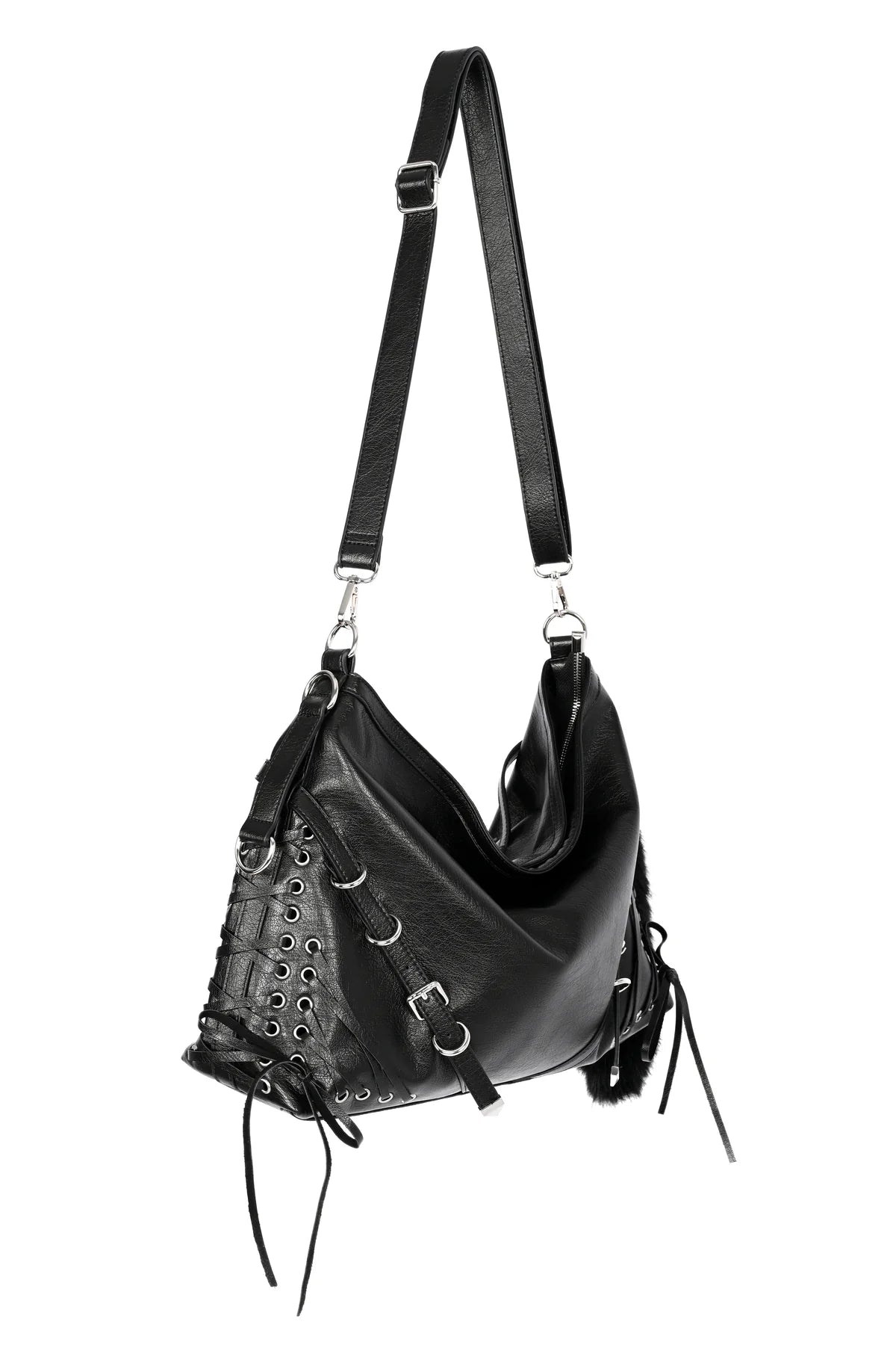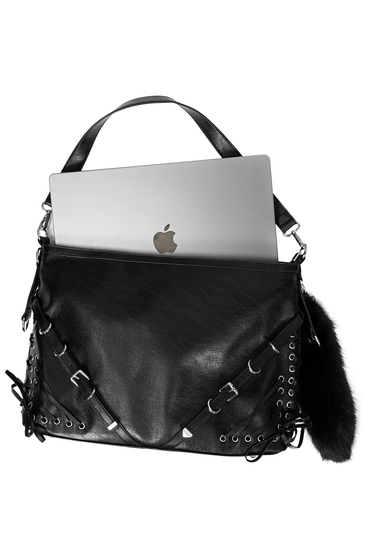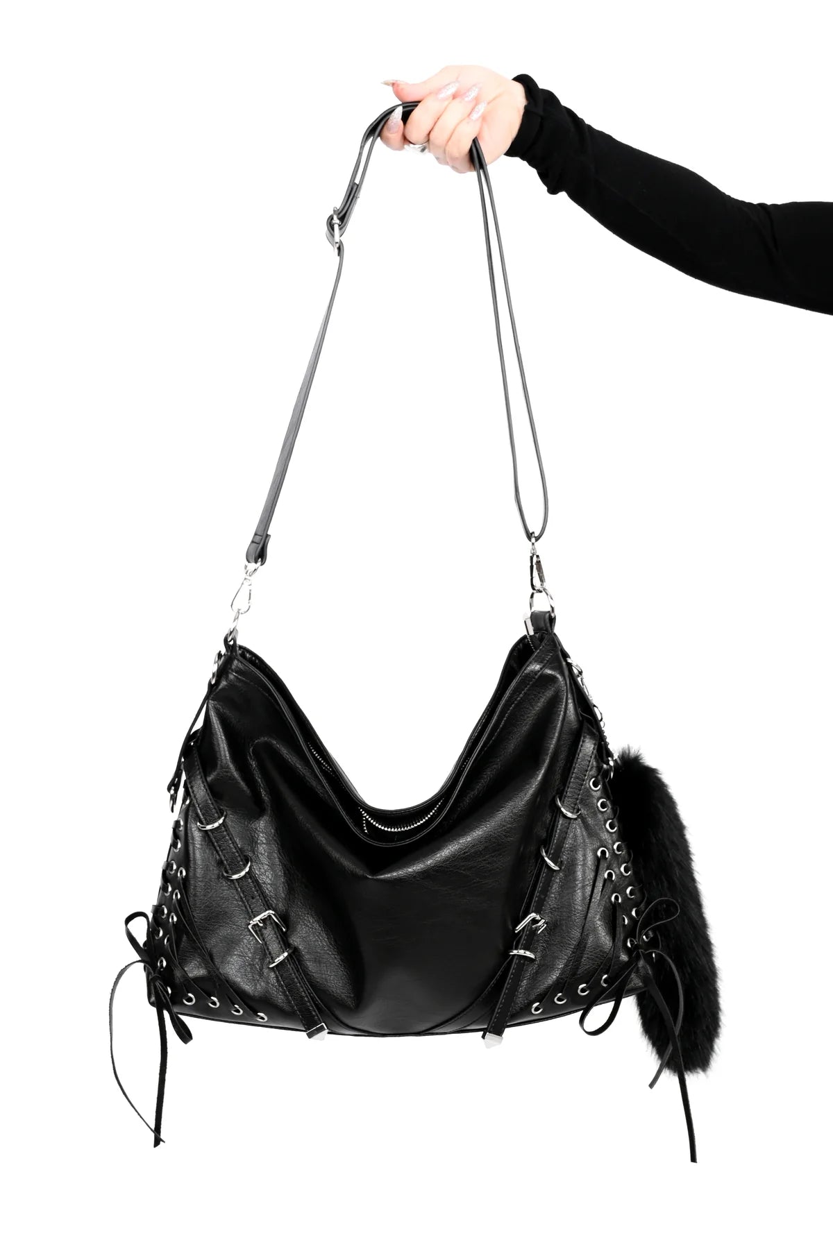 • Black faux fur tail keychain clipped to the side.