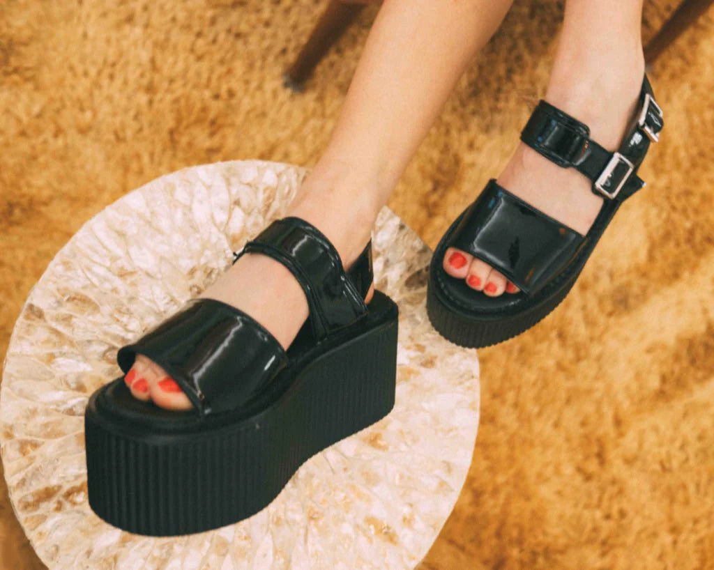 The higher the platform, the better. Features a black patent PU upper on our lightweight VIVA stratocreeper sole that has a platform height approximately 3” at the heel and 2.5” in the front. Includes removable memory foam padding for extra comfort.