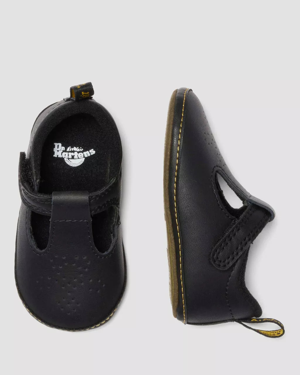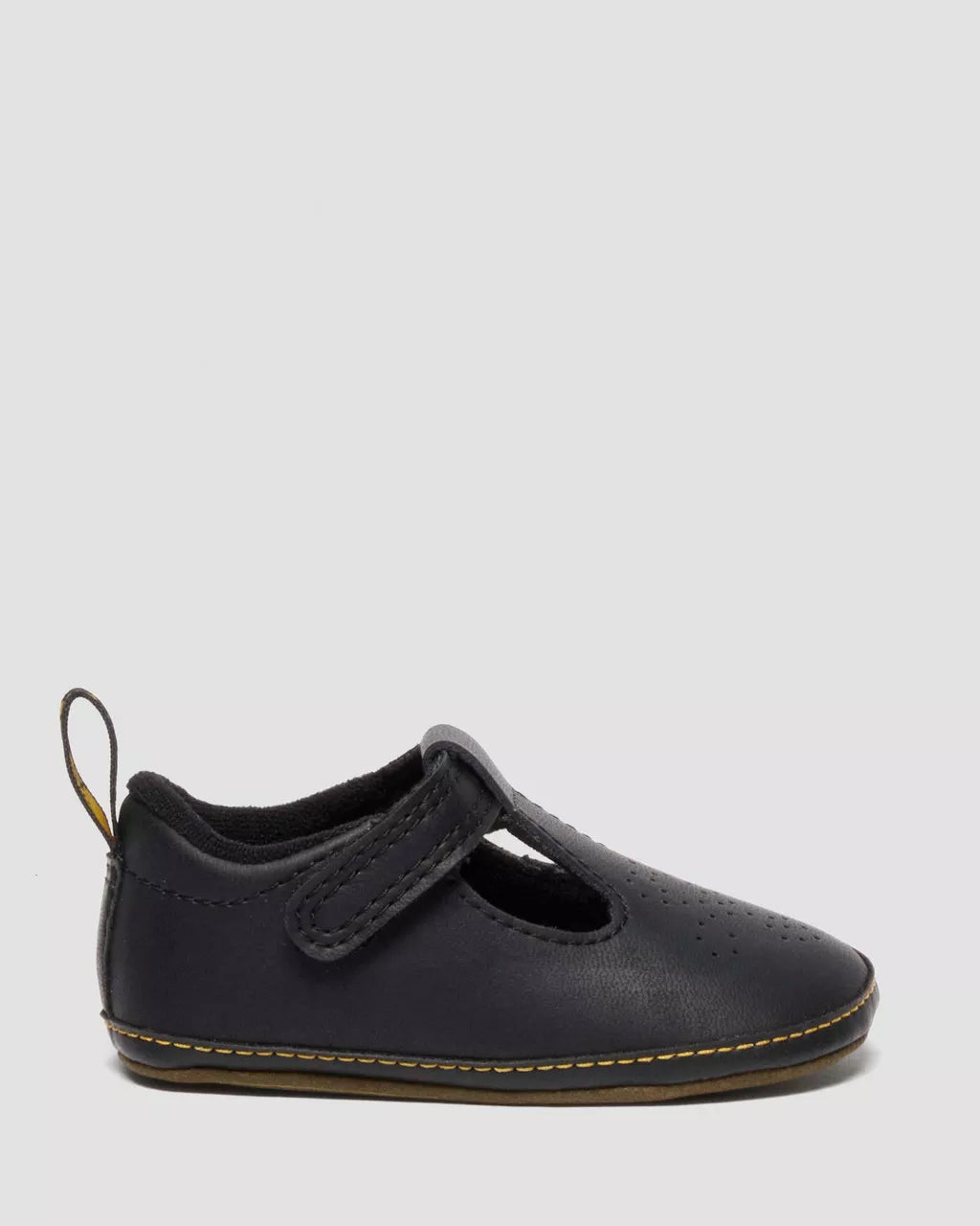Shrunken design for new feet. The Polley Crib shoe takes our smash hit silhouette and scales it down for the next generation of wearers. Built with Mason Split, a waxy PU-coated leather, the shoe keeps the recognisable Polley T-bar feature that’s loved by our wearers. With heart-shaped perforation along the vamp, mock welt detailing and a padded collar for comfort. We finished the silhouette with a mini scripted heel loop and a microfibre sole with DMS tread puff print for those first steps.