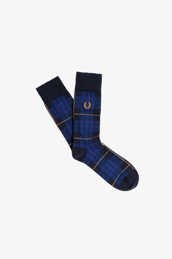Our cotton blend socks in tartan with signature Laurel Wreath embroidery.