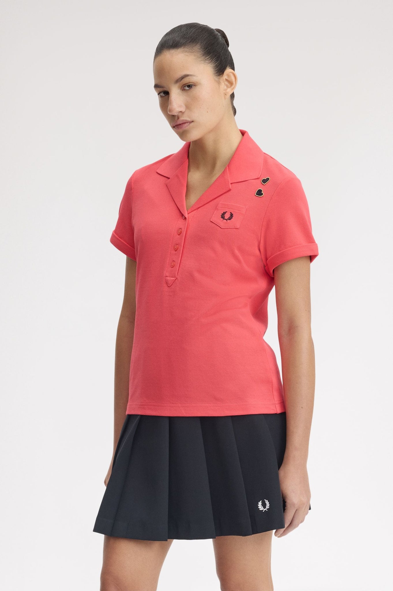 A bright revere collar cotton piqué polo shirt with heart-shaped buttons and Amy's love heart patches.