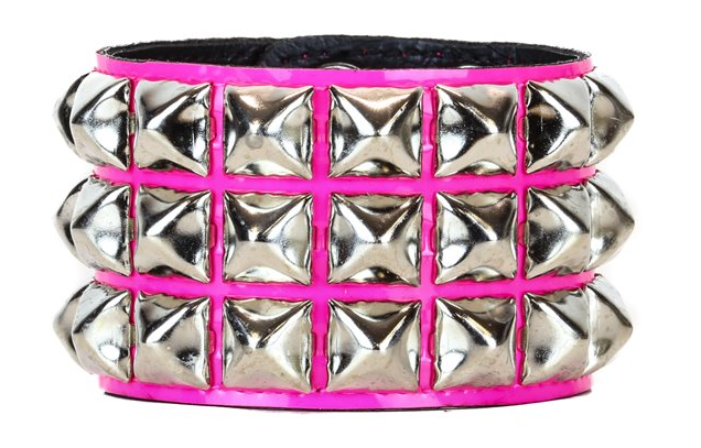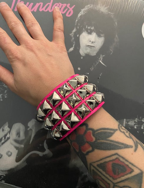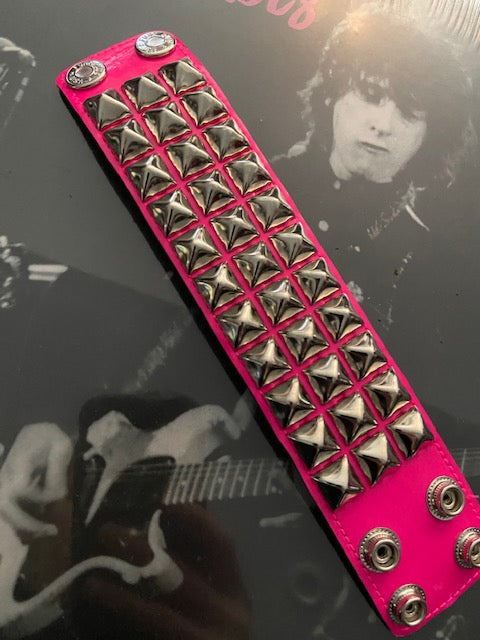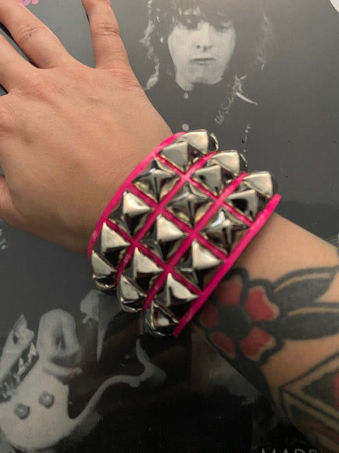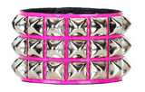 Three row hot pink, pyramid studded wristband with bright nickel 1/2" pyramids. 1.75" wide.