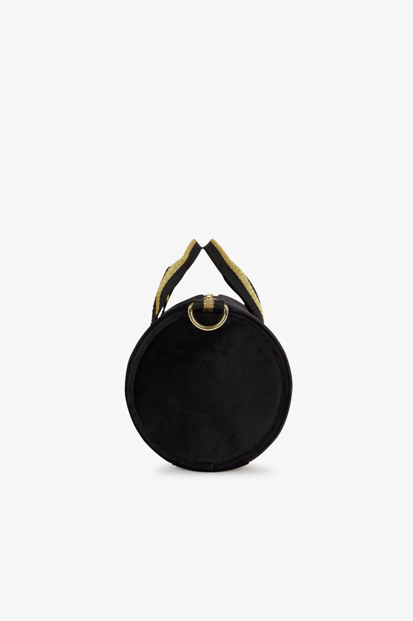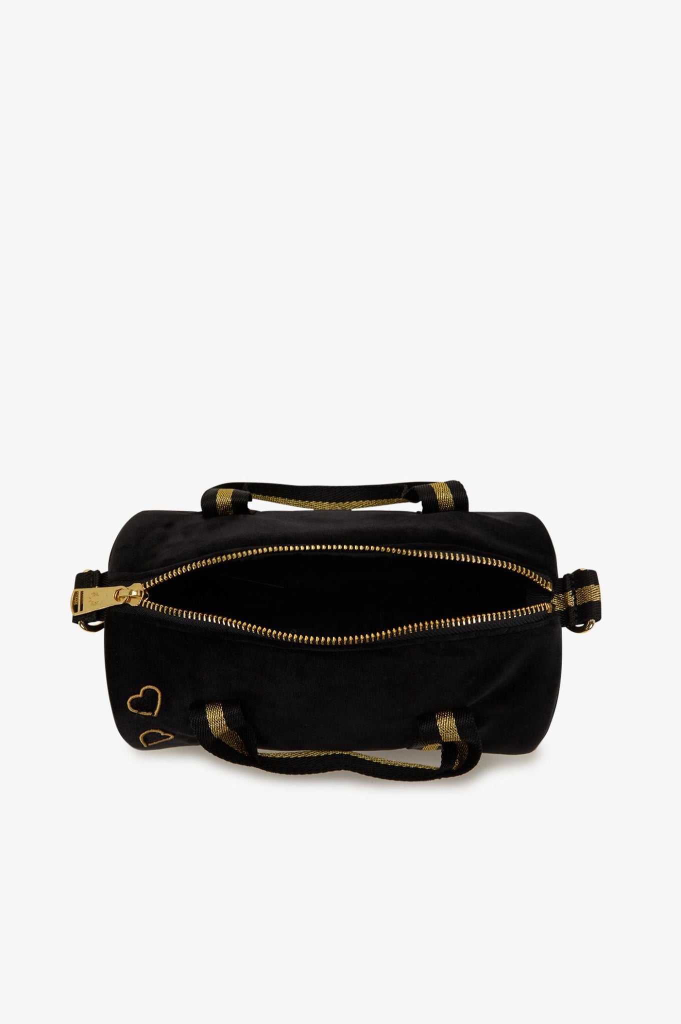 A mini barrel bag that pairs black velour with gold tipping, finished with Amy's embroidered love hearts.