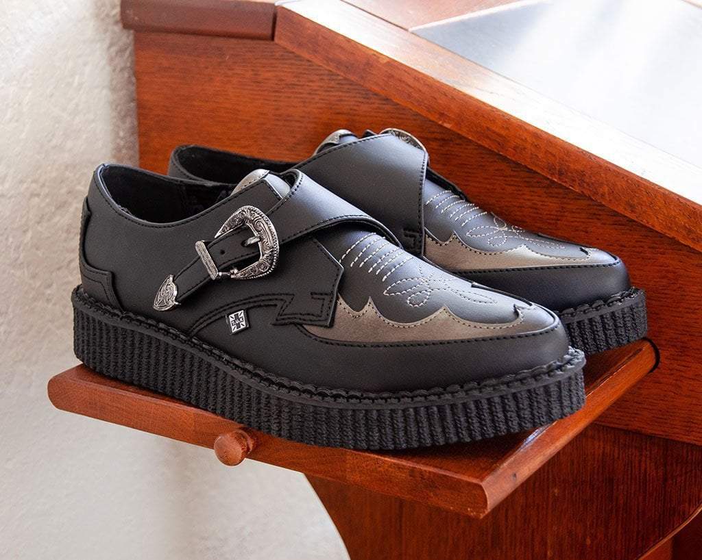 Buckle up and blaze your own trail in these western-inspired creepers. Has a black upper that is made of our high quality TUKskin™ material — polishable synthetic faux leather that is both soft and breathable. Features silver buckle closure, gunmetal burnish apron and western stitching on the vamp. Sits on top of a low sole creeper platform that measures 1 ¼” at the heel and ¾” in the front and has removable memory foam insoles for added comfort.