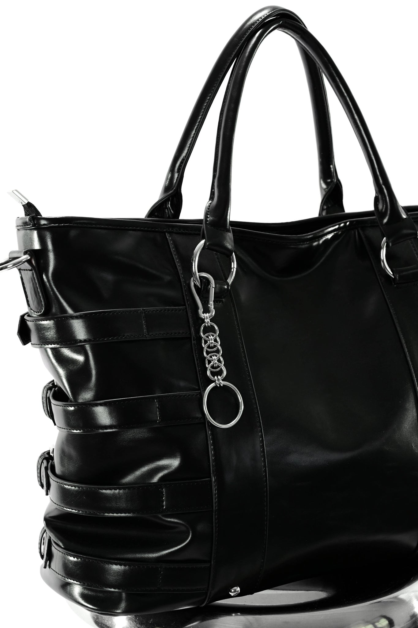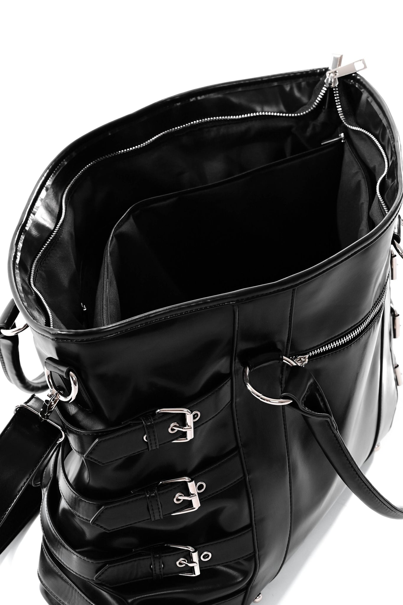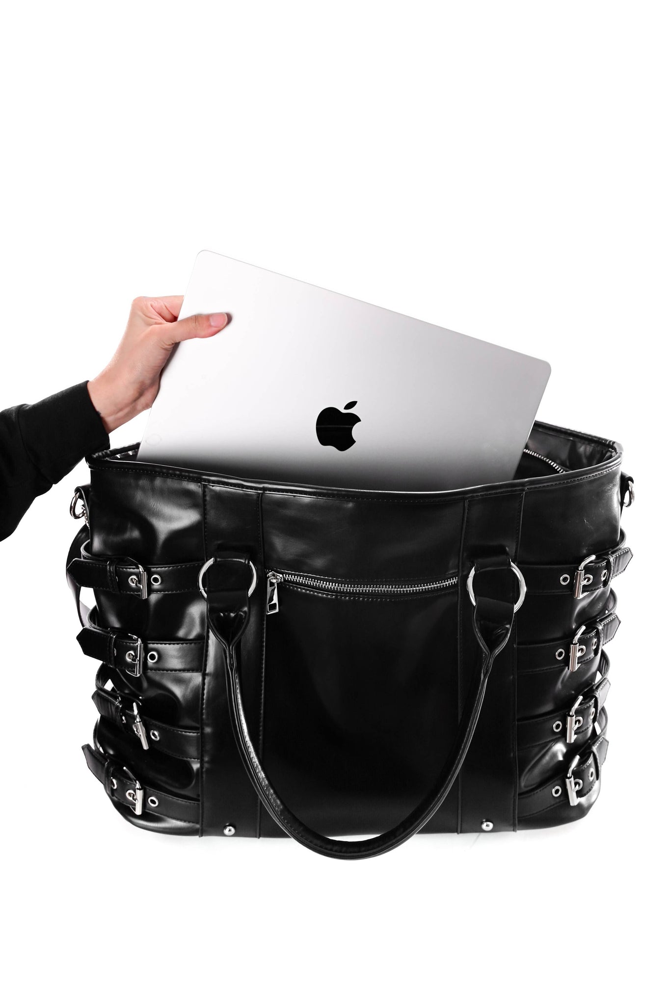 The ultimate work bag for us. This bag is big enough to fit your laptop, books, trinkets etc. All the essentials you could need in your day! Made out of a smooth, soft but sturdy PU Vegan Leather. Complete with belted details on the side and all silver hardware. Inside is a large padded pocket that can be used for a laptop up to 17" x 11", with plenty of space around the pocket. There is also a zipper pocket and open side pockets. Functional front zipper pocket detail. Top handle straps and an adjustable/removable crossbody strap included. 20" x 13" x 6" 100% Vegan Part of the FOXBLOOD Signature Collection