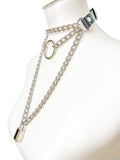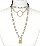"Chain Me To You ..." Killer Triple Chain Choker with O-ring , PLUS a long hanging lock on chain on a Silvery Chain Necklace. Buckle closure for ease of wear.