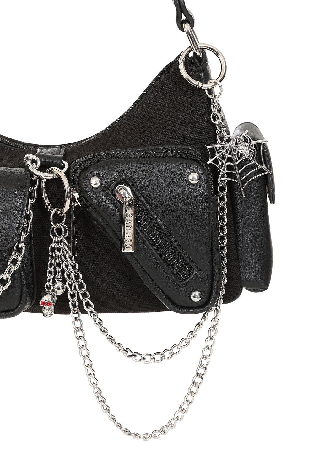 Keychain, yes! Shoe Accessory, yes! Purse Charm, duh! This versatile charm can be clipped on just about anything.  Makes for a cute gift too! The Banned Web of Fate Spiderweb & Skull Double Chain is darkly intricate featuring a bold spiderweb design intertwined with skull accents