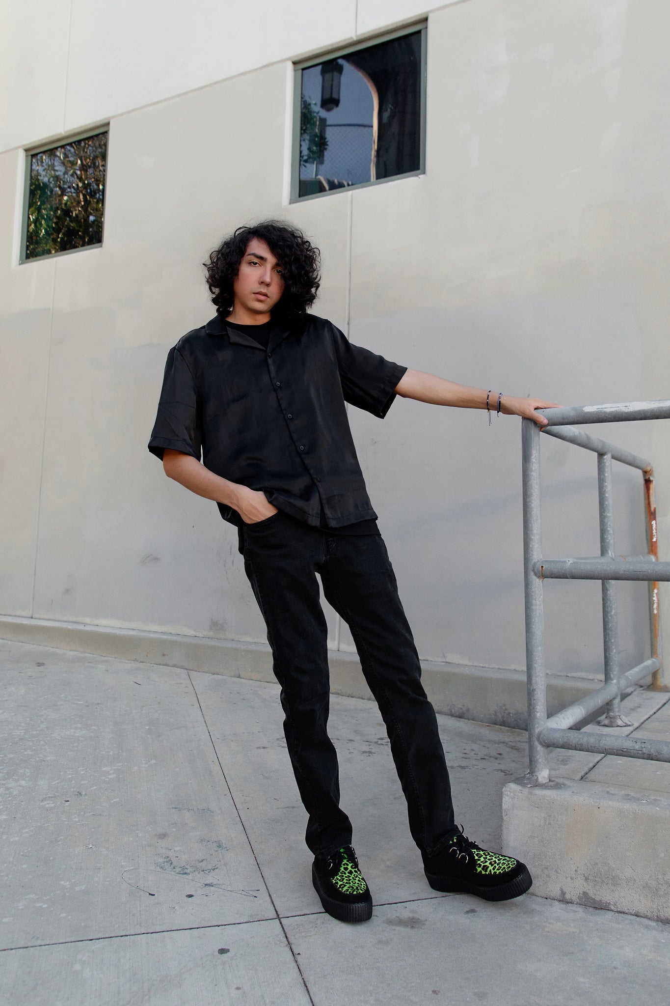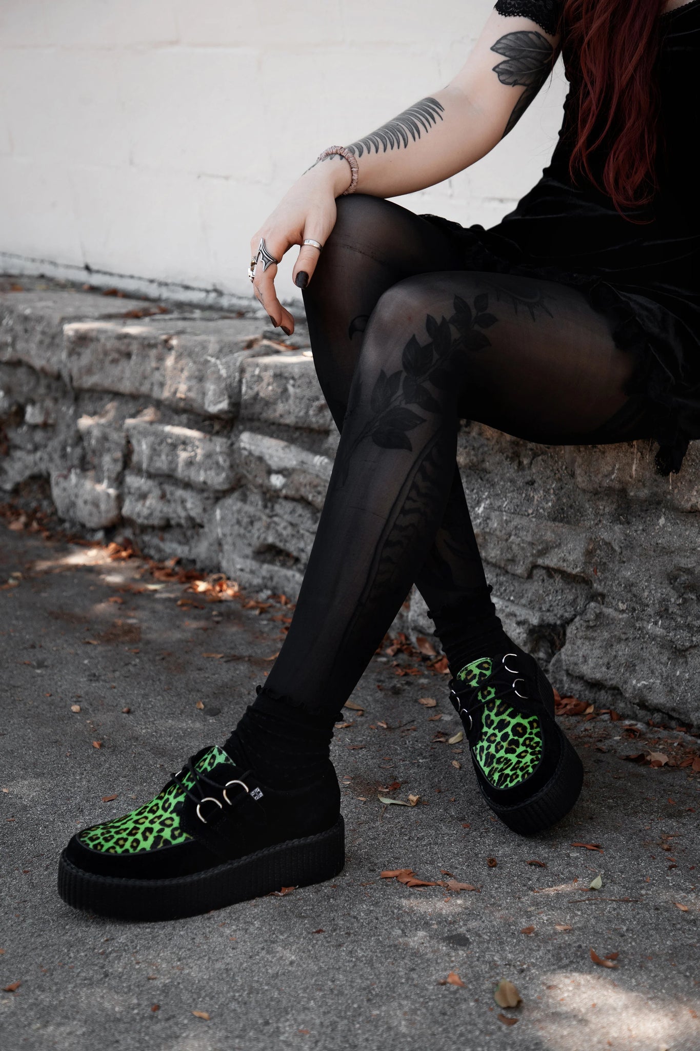 Unleash your wild side with the Black & Green Leopard Suede Mondo Creeper. This striking shoe combines vibrant green cow hair leopard with black suede details, giving your look a fun and fearless edge. The thick creeper sole adds playful height and comfort, perfect for making a bold statement wherever you go. Step up your shoe game and let your feet do the talking! Our classic Viva Mondo sole measures approximately 1 ¾” at the heel and 1 ¼” in the front. Comes with removable memory foam padding for added comfort.