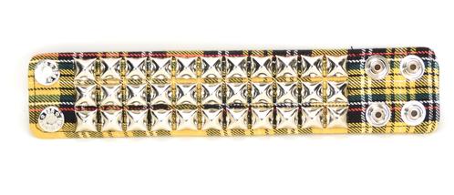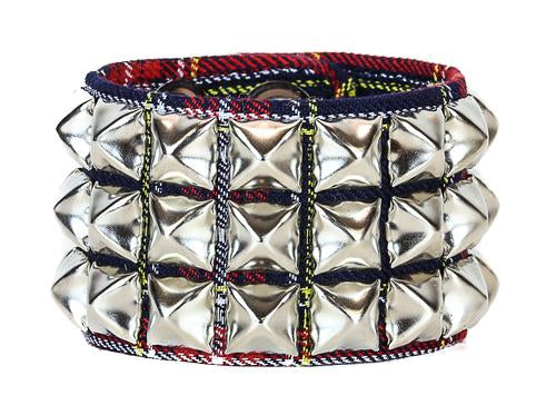 Three rows of 1/2" silver pyramid style studs on a killer plaid wristband with snap closure. Available in various colors, pick your favorite plaid!