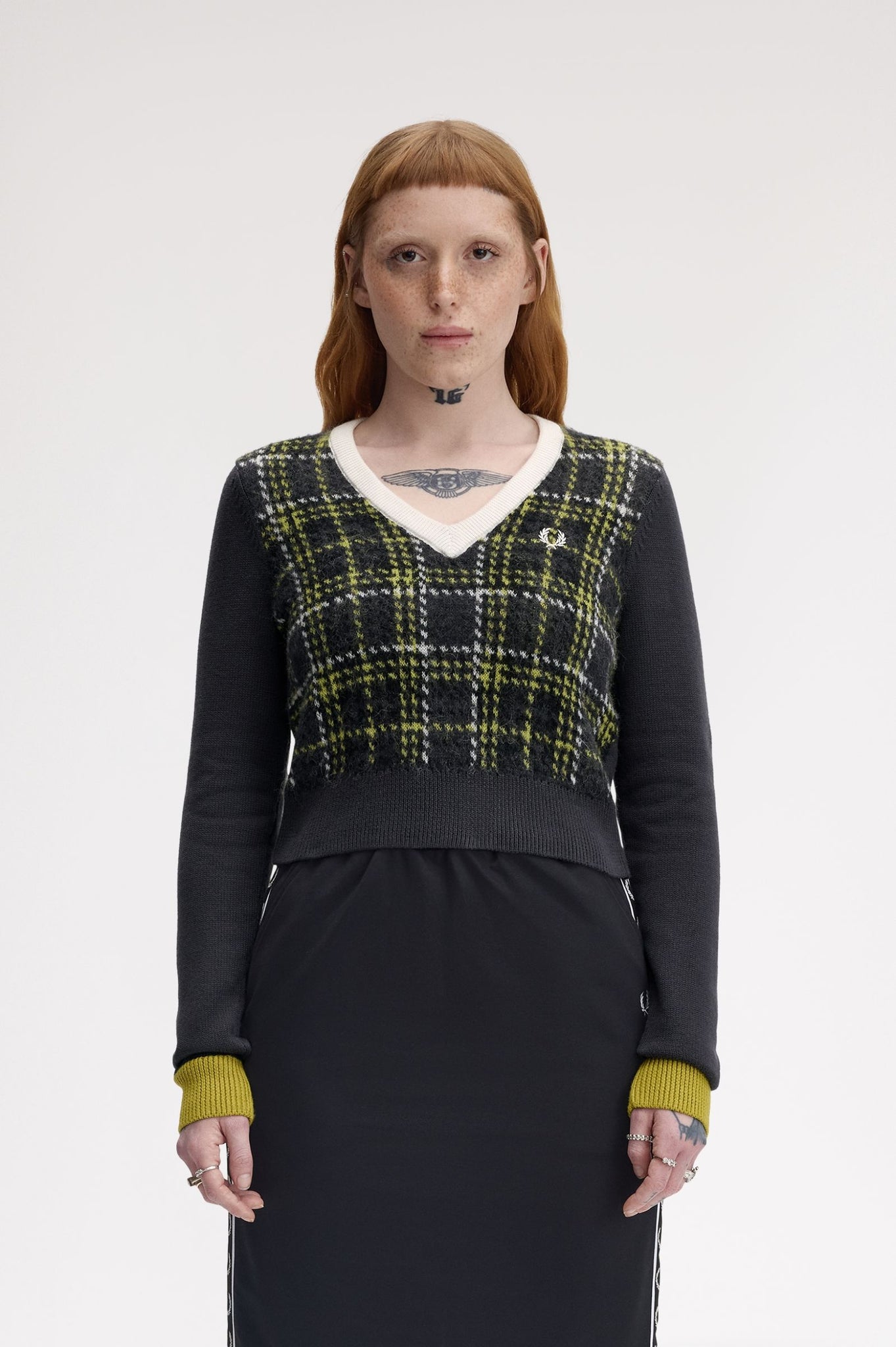 A cropped tartan jumper with contrast cuffs and a deep V neck.