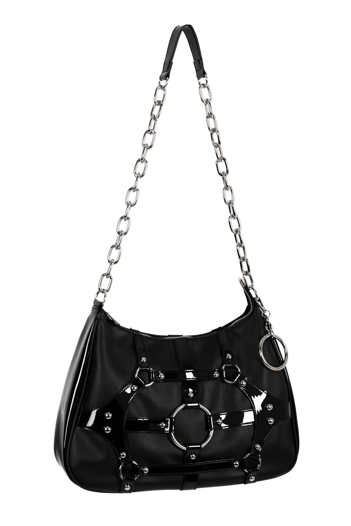 • Black PU shoulder bag with black shiny PU detailing, plus silver o-rings and hardware.