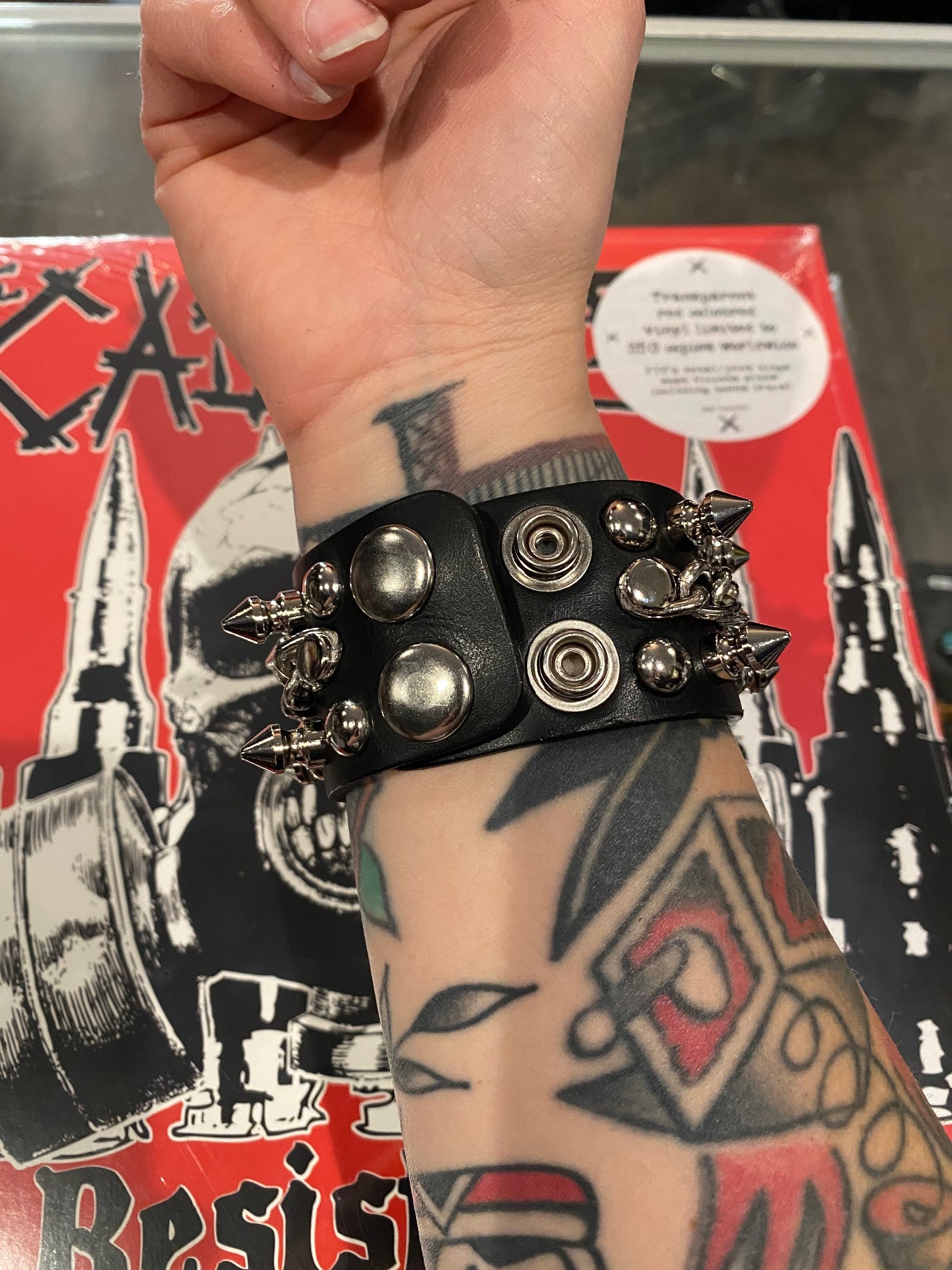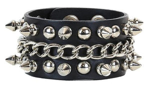 Raise HELL! This rad leather wristband features a chain in the middle with alternating 1/2" spikes & round spot studs.  Snaps closed