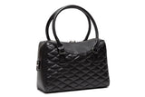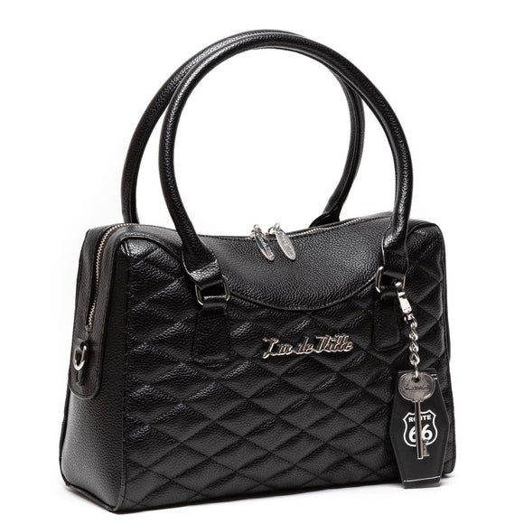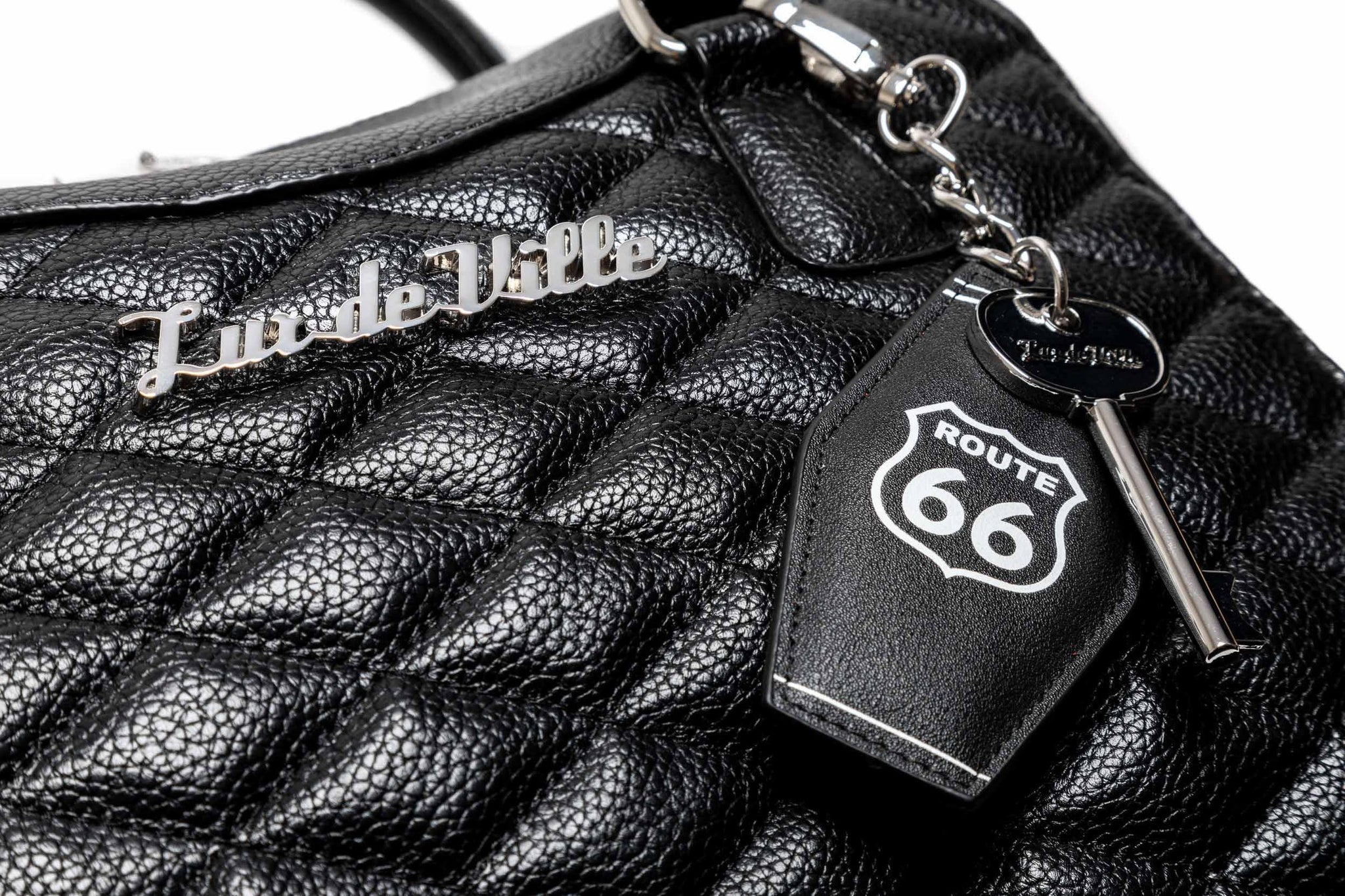 Hit the Road with the new Route 66 Tote! These fabulous totes feature all over diamond stitching, detachable Route 66 motel bauble, and Lux de Ville logo plate. Inside is lined with black on black leopard, has a zipper closure pocket and silver bullet on the bottom. Also comes with a detachable and adjustable cross-body strap. Get your kicks on Route 66!