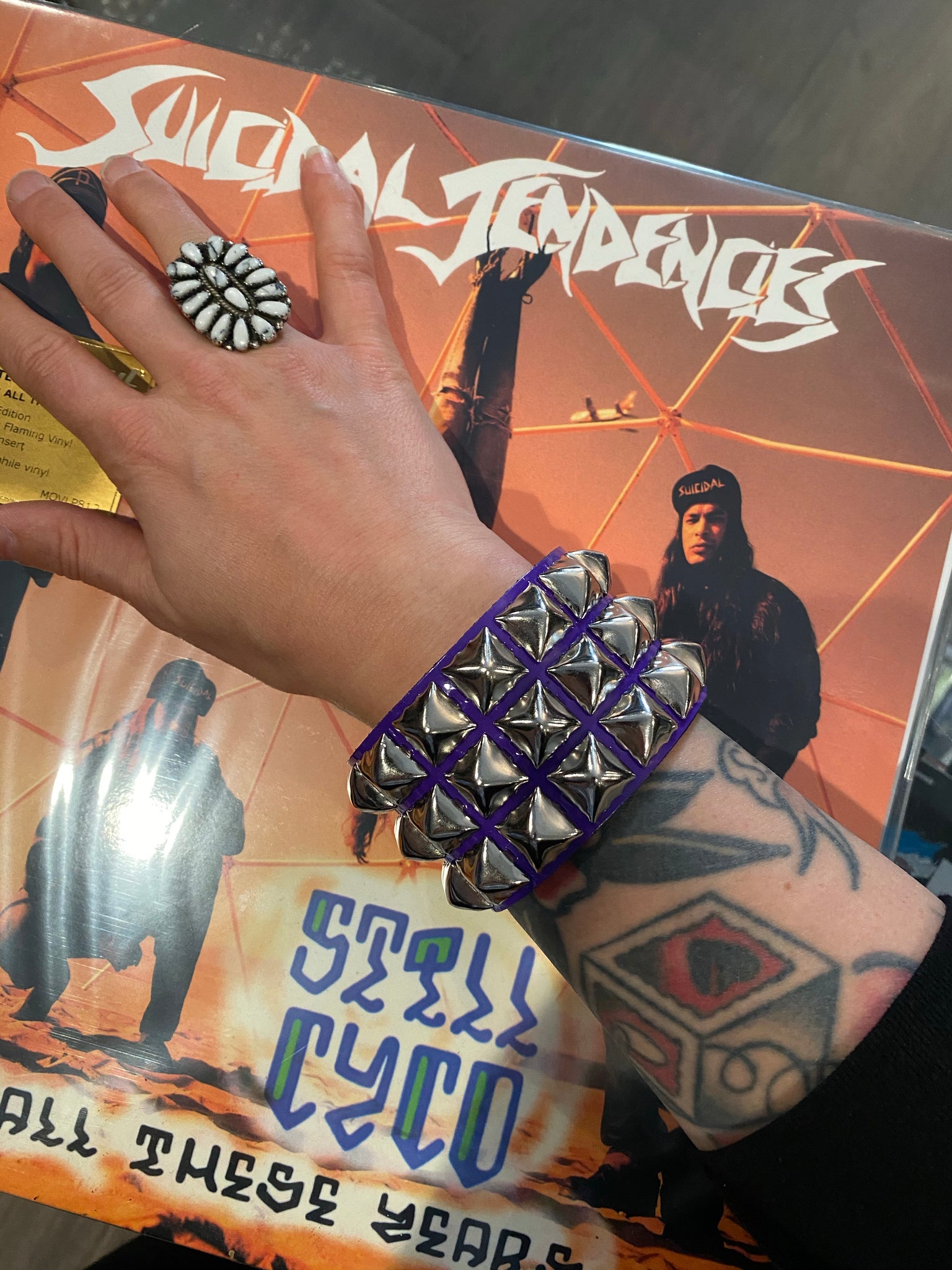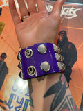 Three row bright purple, pyramid studded wristband with bright nickel 1/2" pyramids. 1.75" wide.