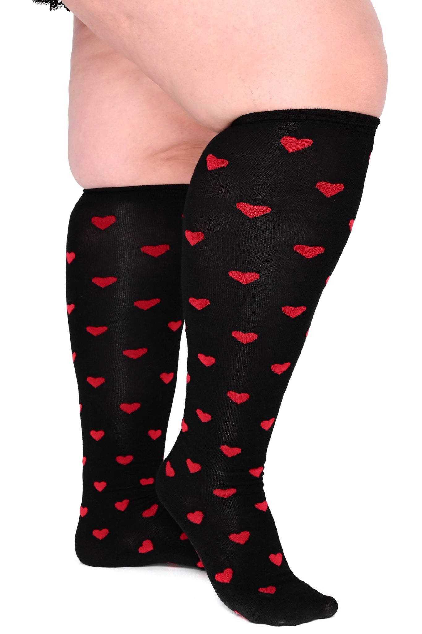 Be My Valentine? Y/N.. Black socks with red hearts all over Approx 26" long with a lot of stretch. We trial ran so many versions of these to get the stretch right! These socks stretch approx 25” at the top to accommodate most legs. You can wear them over or under the knee, as you like! For over the knee, if you have a more V shaped leg, they might roll down a little, so we’d recommend cute thigh/sock garters.