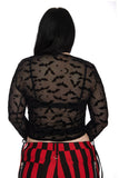 For the batty babe. This four way stretch mesh top features thumb holes, adjustability from both side seams & a perfect length, with long sleeves. Spooky cute Bat & Moon flocking all over too. It works great with skirts & pants alike!
