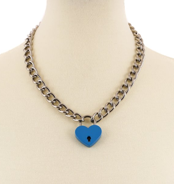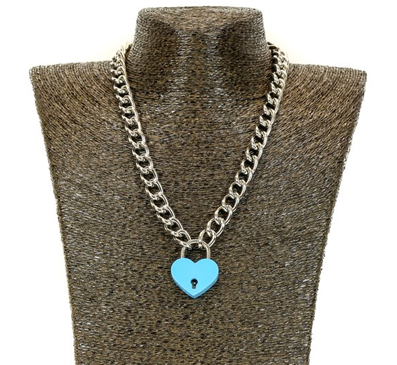 "I found the keys keys, Yeah the keys to your heart heart, Yes I got them on a chain chain...."  Shiny Silvery Chain with Blue Heart Lock Necklace.  Heart Lock opens & closes to get on.