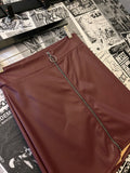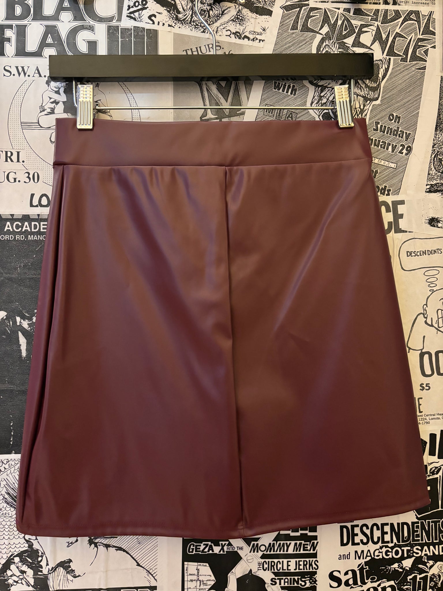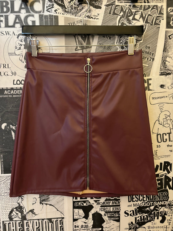 Full frontal zip burgundy faux leather skirt. Tight & short!