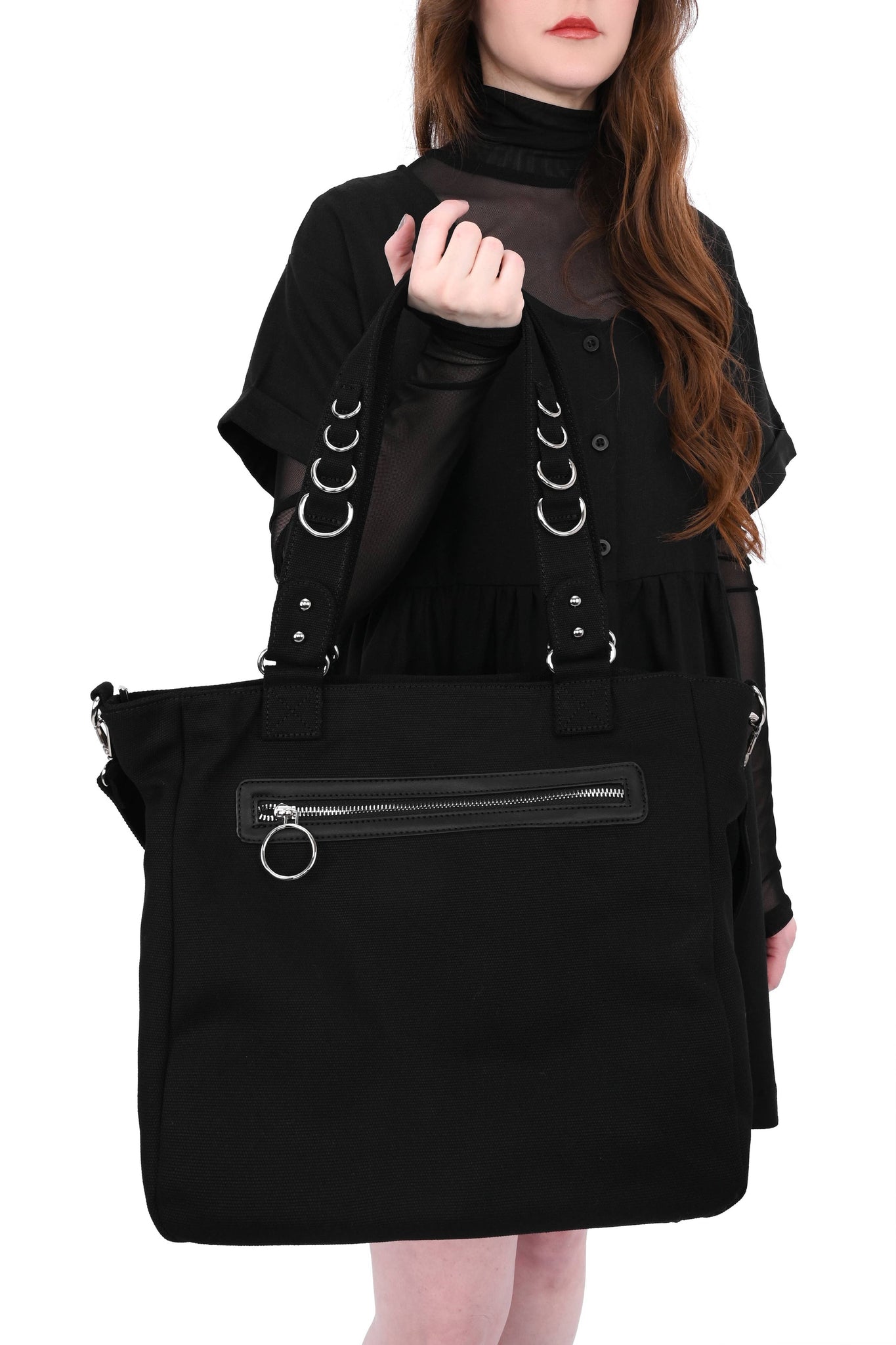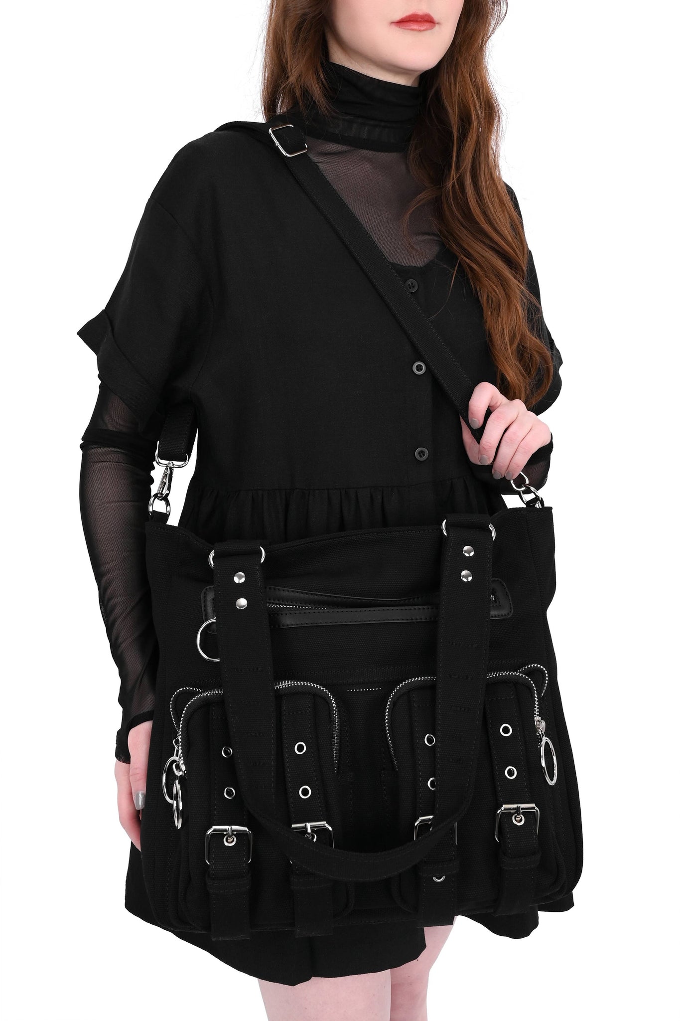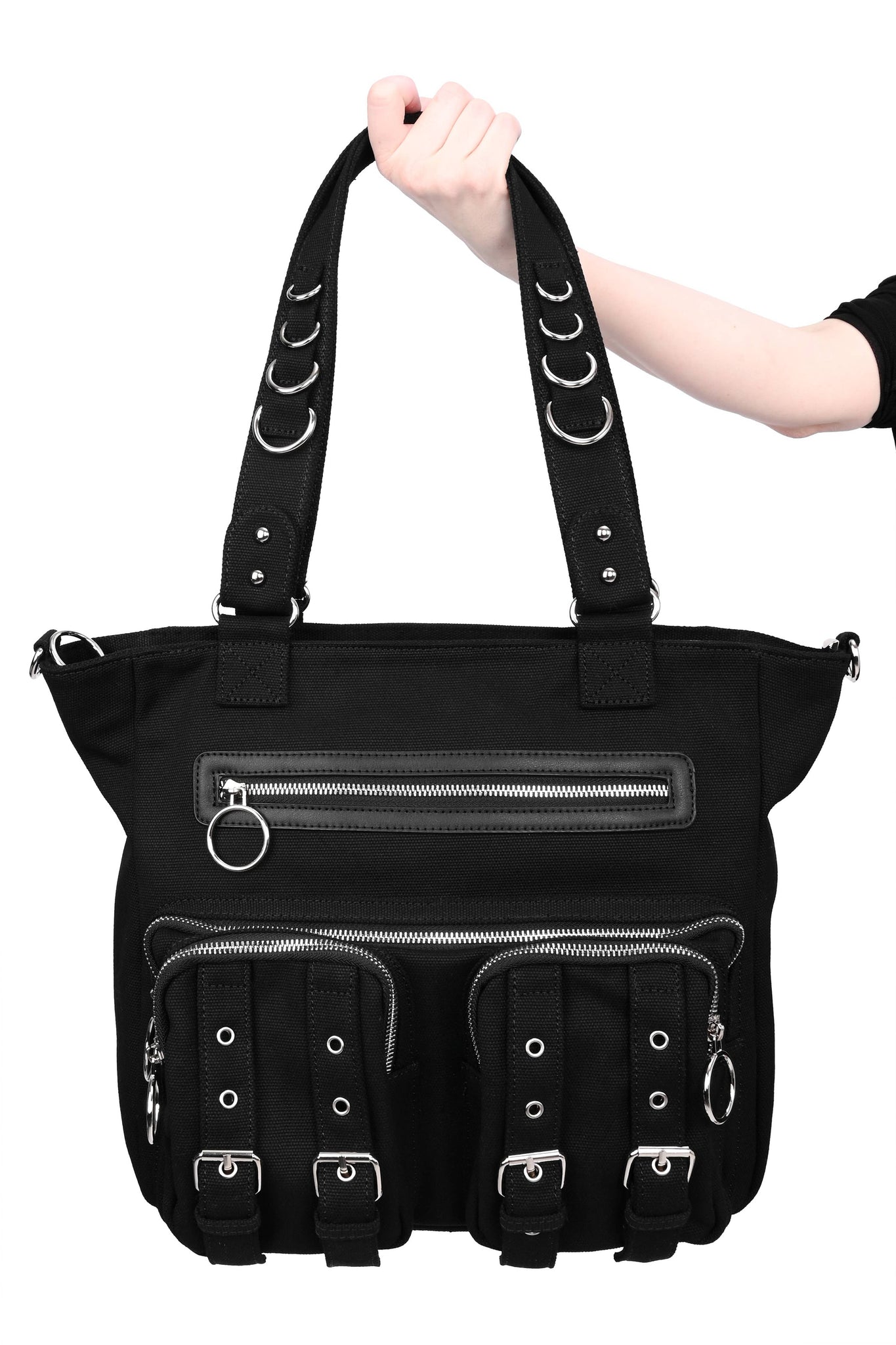 Lots of D-Ring hardware to hang your keys and bag charm trinkets off of. Made out of a high quality, durable black canvas. Main zipper top closure. On the very front there is two spacious zipper pockets, and another larger pocket on top. As well as one zipper pocket on the back. Inside there is one zipper pocket and and two open pockets. All silver hardware. 100% Vegan Part of the FOXBLOOD Signature Collection