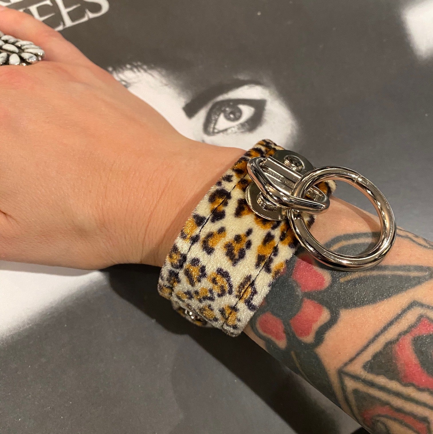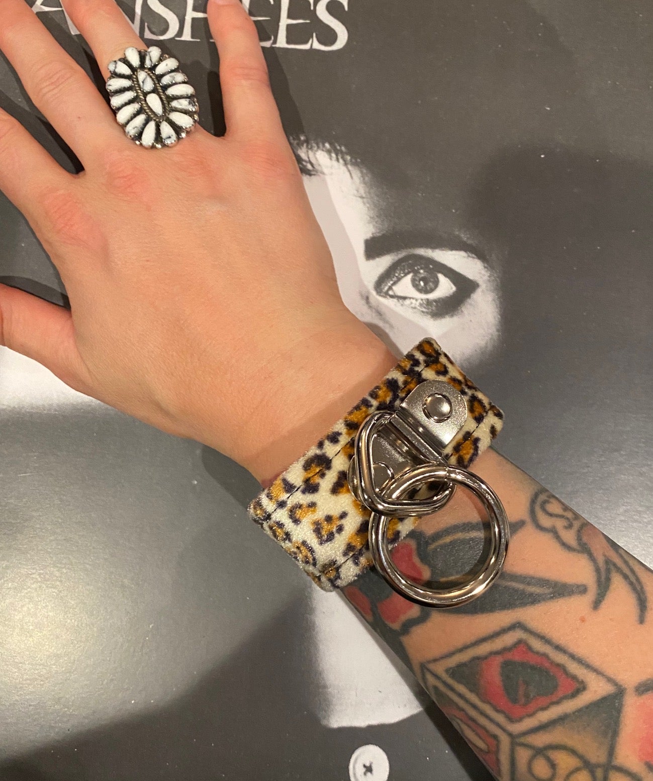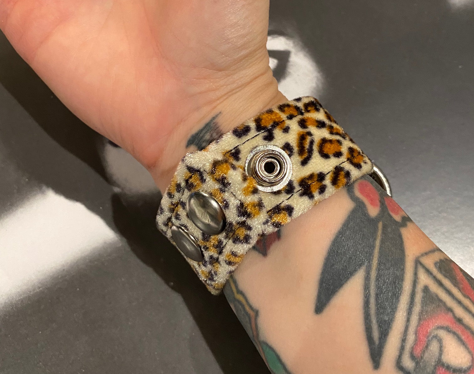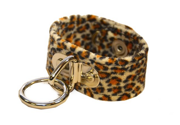 Fuzzy leopard print band with single bondage ring & a, adjustable double snap closure. 5/8" wide band with 1" ring