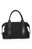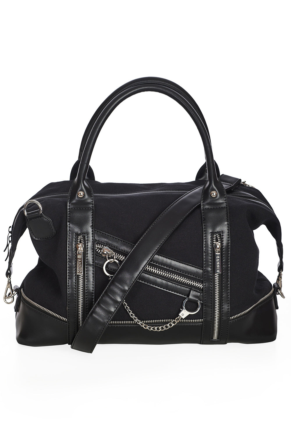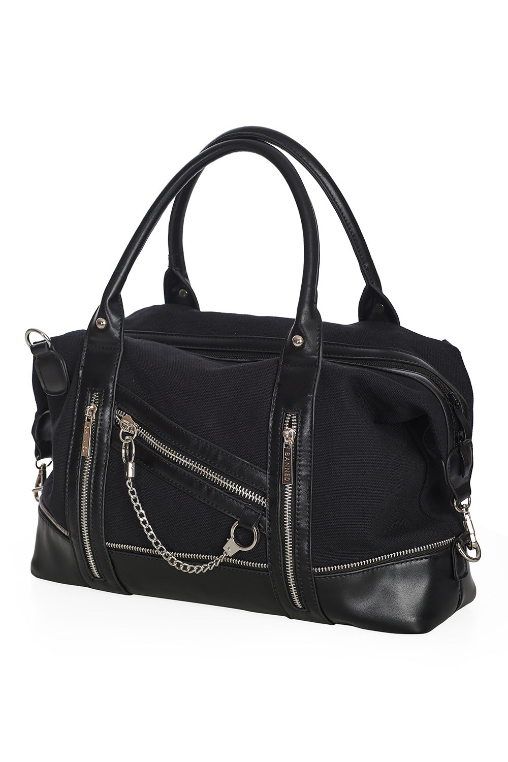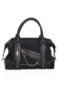 You'll love this classic shaped handbag, featuring a front zip with cuffs & an all over black canvas style fabric. Also includes a detachable long strap for ease of carrying.