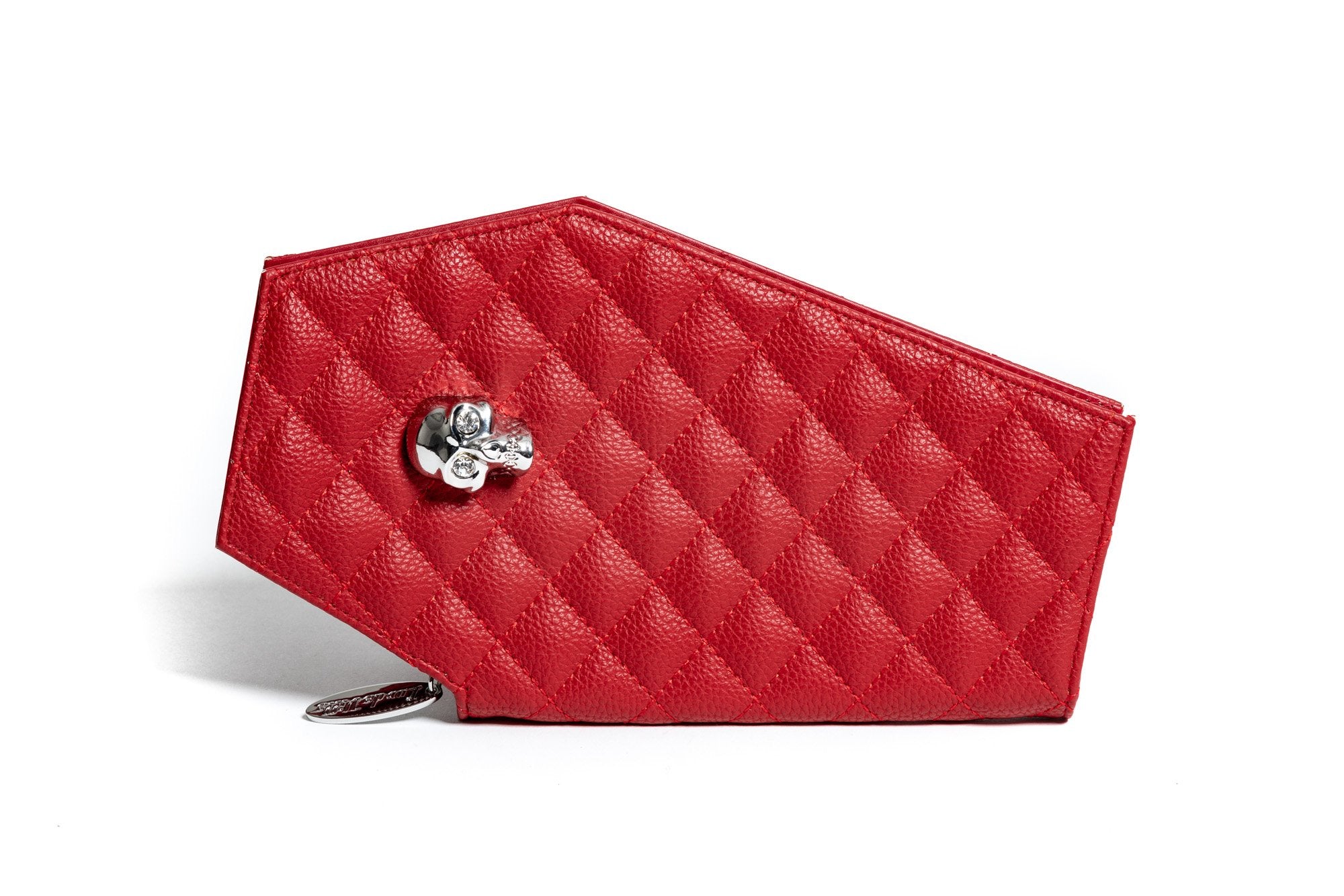 This evil, but sexy, oversized wallet clutch is perfect for the goth on the go. With a killer coffin shape, it features a diamond stitch pattern, our silver skull head with rhinestone eyes, and plenty of card slots to stash your loot. Enjoy!