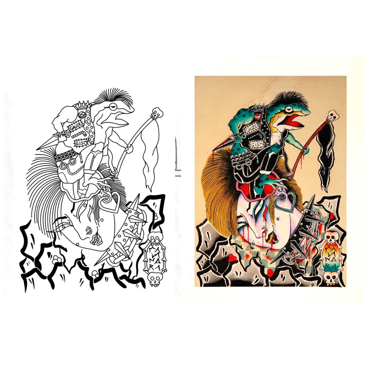 60 subculture frogs in full color and line art on 120 pages in a 6 X 9 inch book.