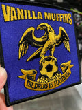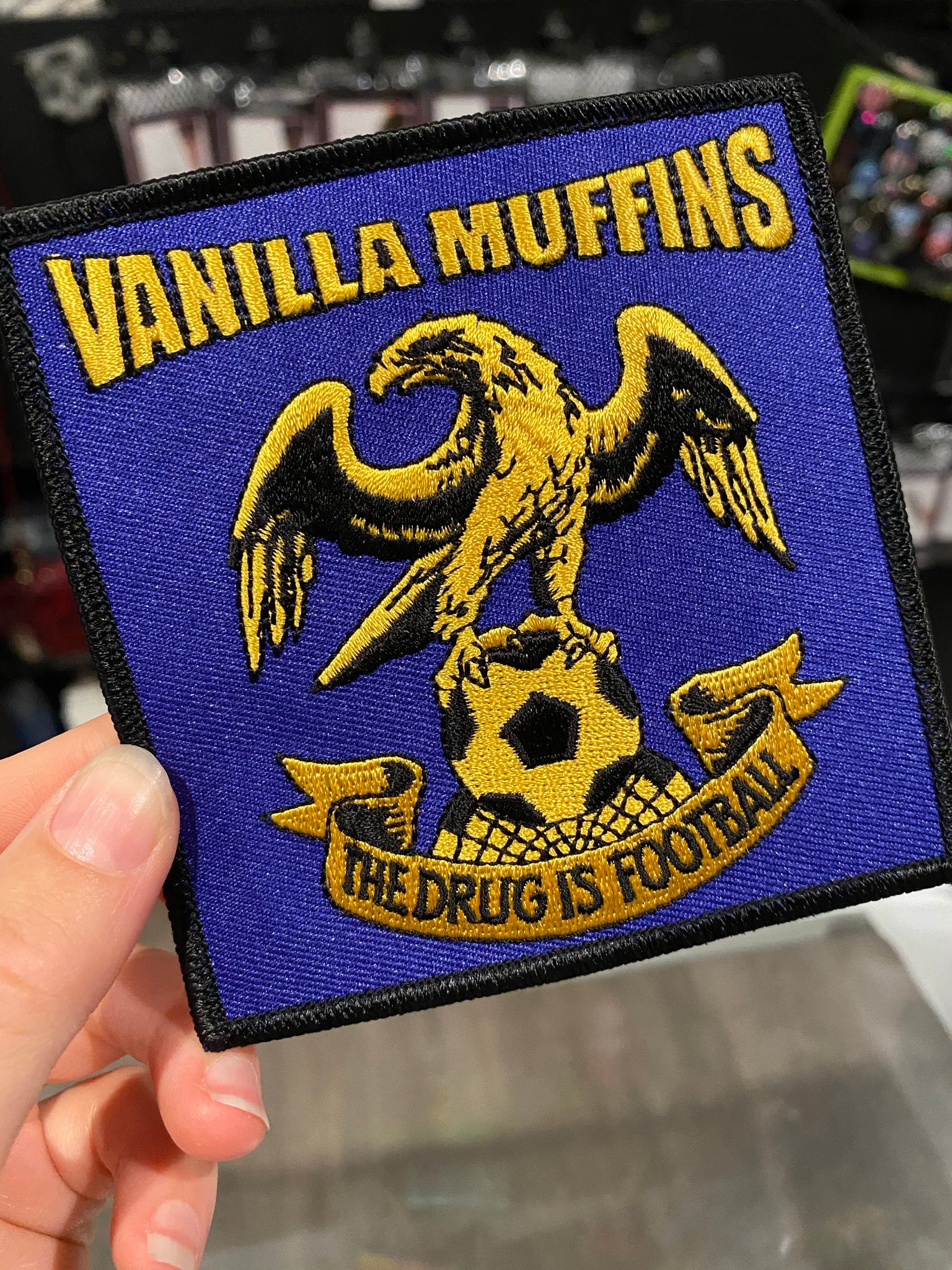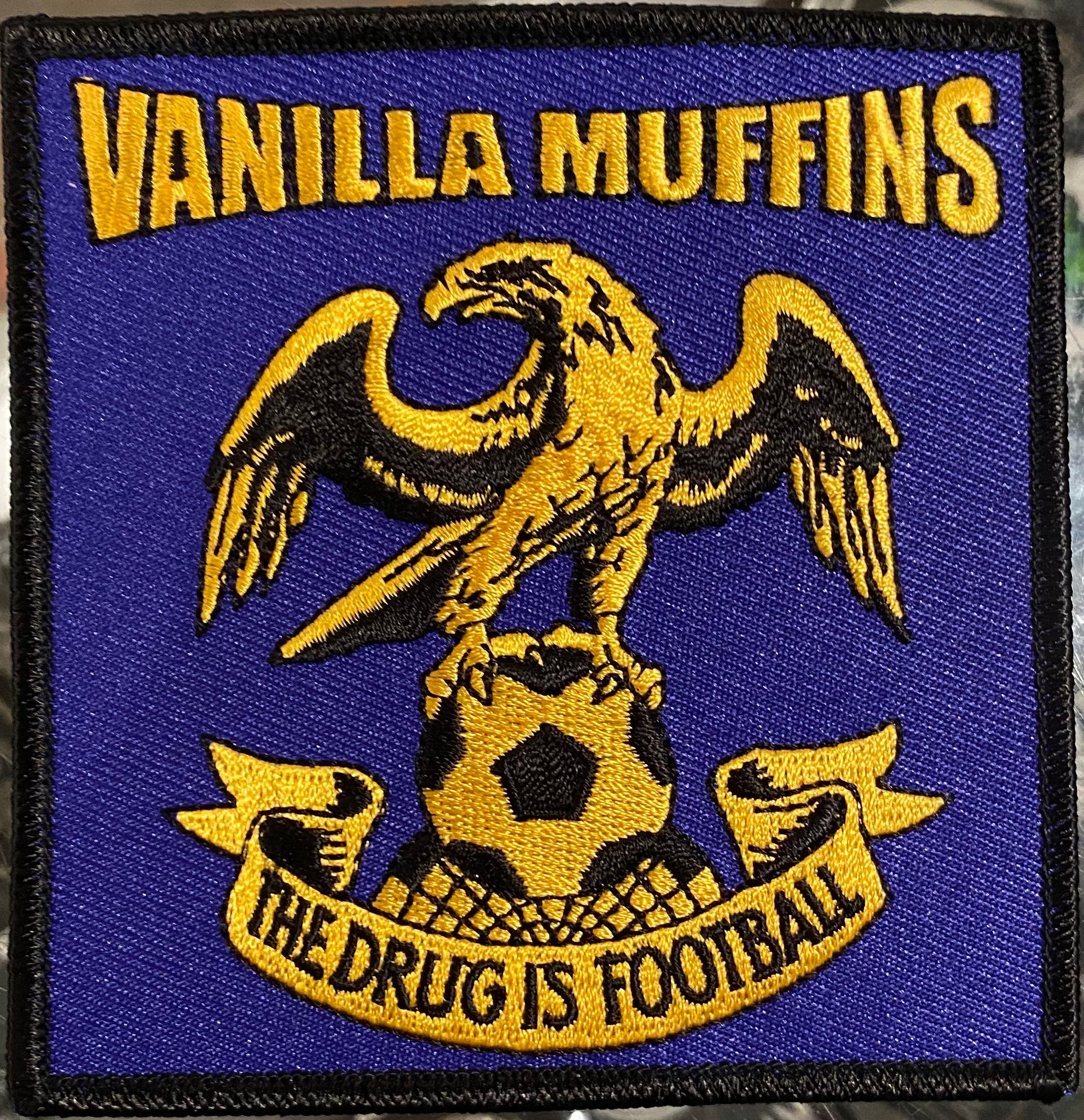 Gimme Some Sugar...Oi! Check Out the New Vanilla Muffins Embroidered Patches Featuring the classic 'The Drug is Football' logo in yellow & black on a navy blue background.